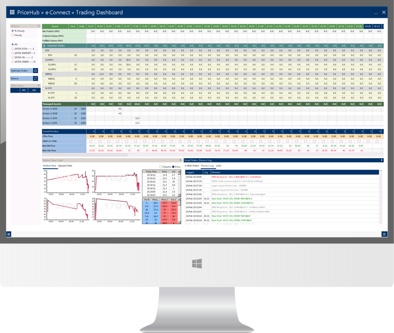 We have built e·Connect with an overview of these challenges and taken care of them keeping the Intraday Trader and his struggles in mind. e·Connect automatically receives Orders from multiple sources, including the internal ETRM systems, and provides the Trader with an intuitive Overview of the positions and prices. Orders received via e-Mail and ftp are processed automatically and are assigned a merit-order based on price, volume and timestamp. The system Optimizes all Orders internally before pushing the residual volumes to EPEX. Matching takes place within price limits assigned by the Customers and market prices.